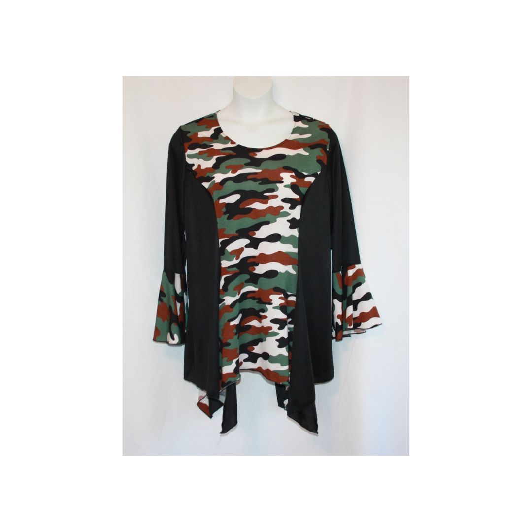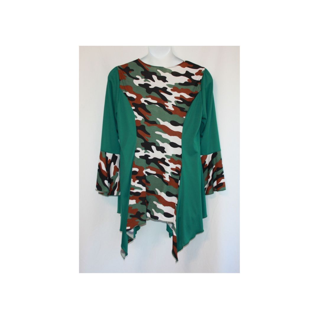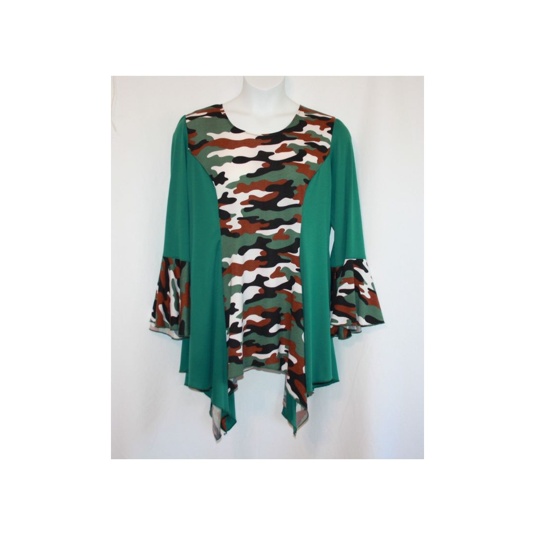 Flounce Sleeve Knit/Camo Blouse comes in Black or Green Knit. Matching pants can be added, Straight Leg, Wide Leg Dance or Palazzos. Very comfortable to wear and travels well.