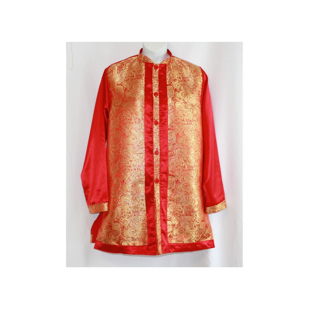 Men’s Red/Gold Brocade & Satin Jacket. Matching pants can be added for $20.00 (narrow leg pants).